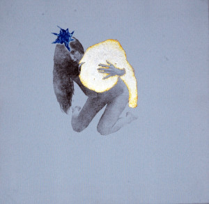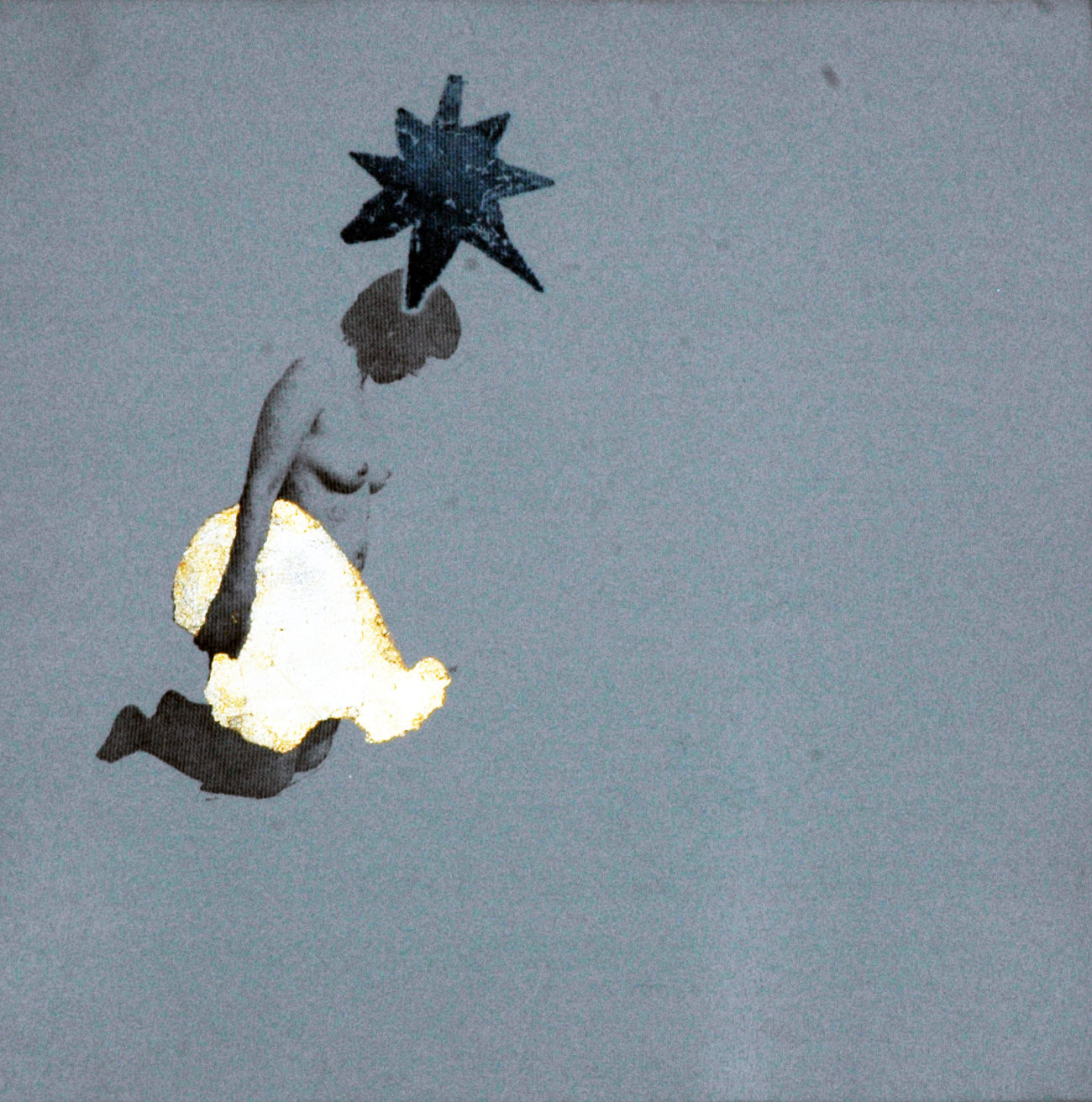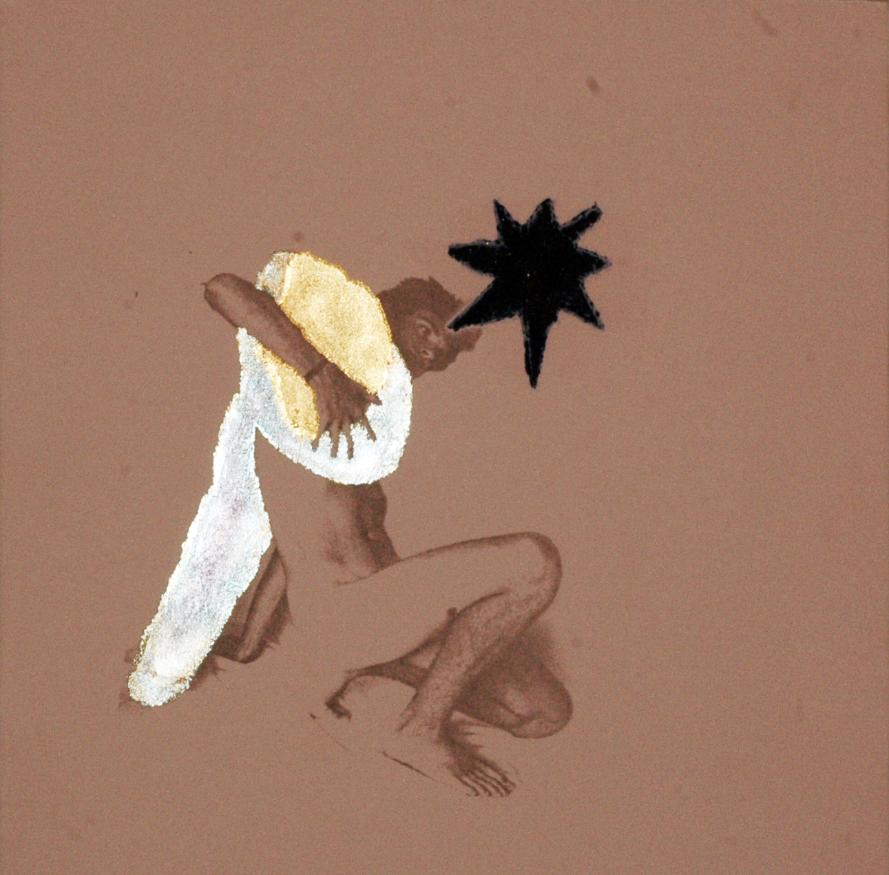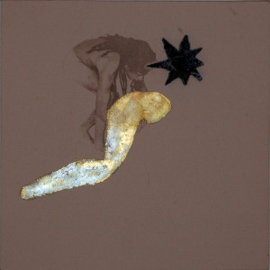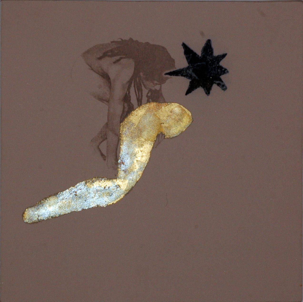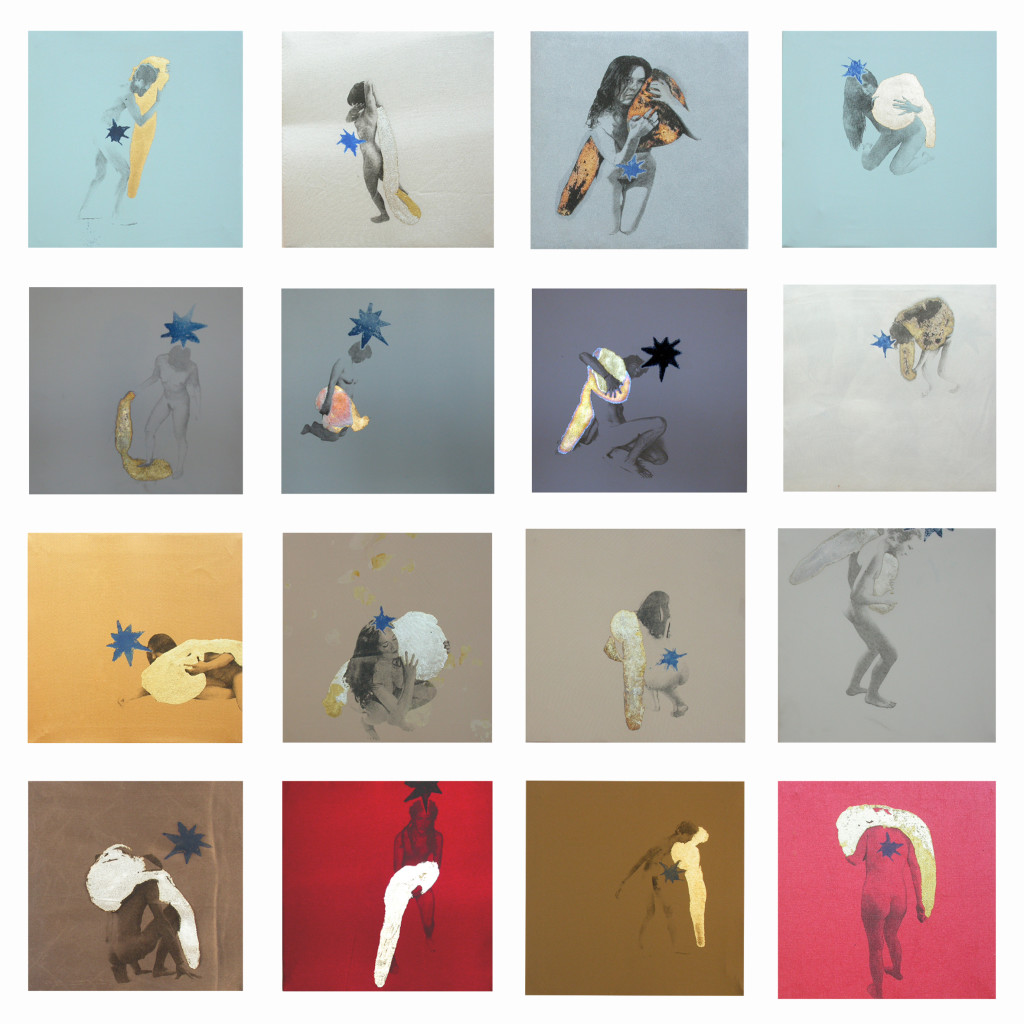 16 sacchi alchemici 2005_transfert e stampa calcografica, foglia oro e argento su stoffe_27x27cm. cad.
