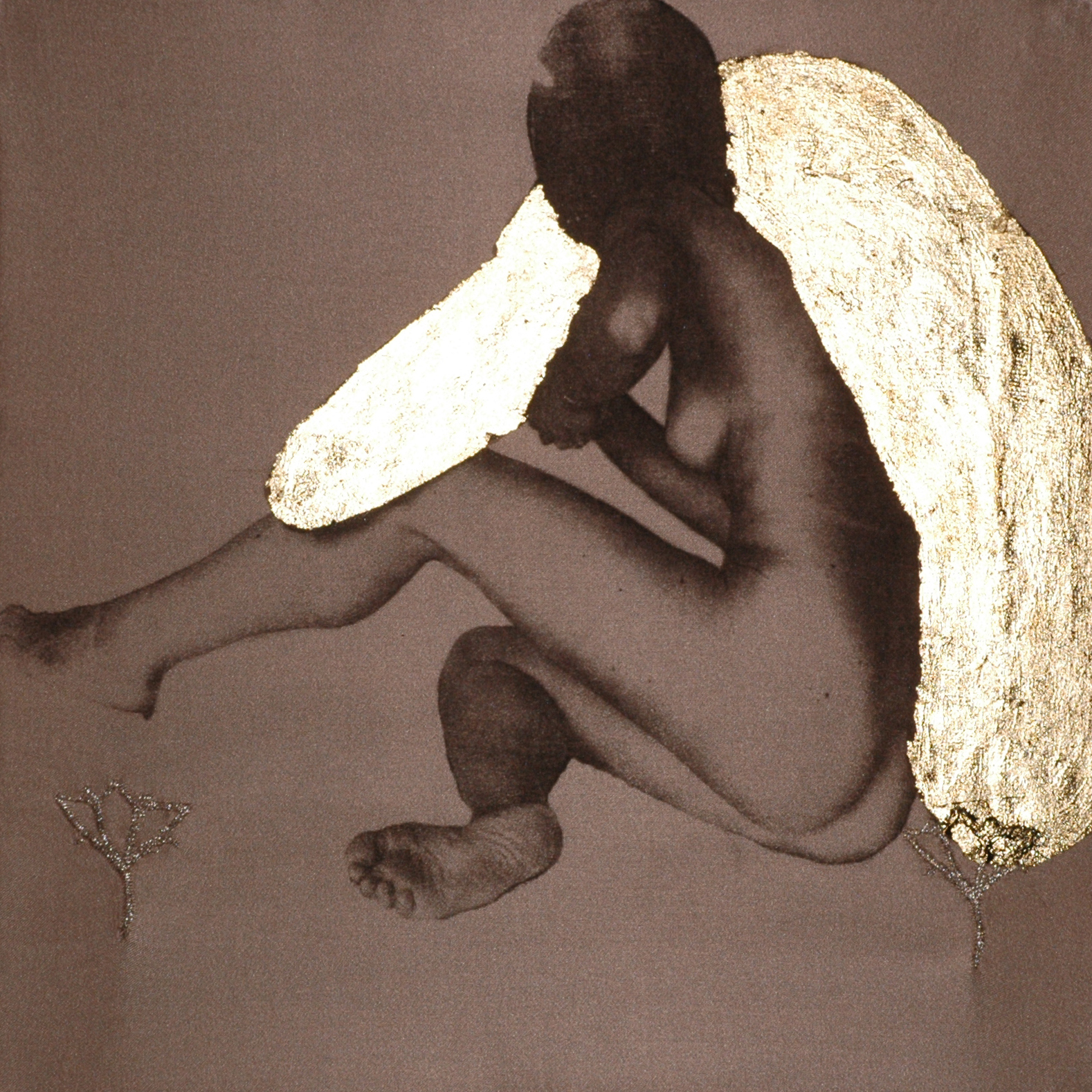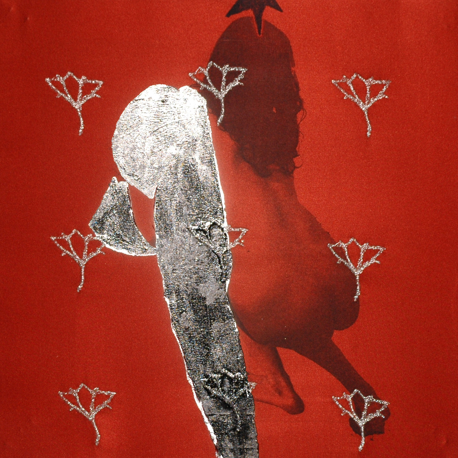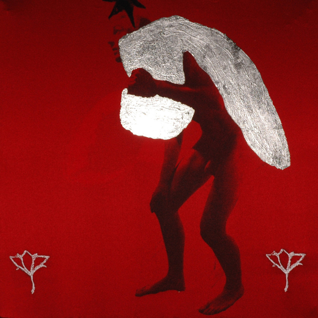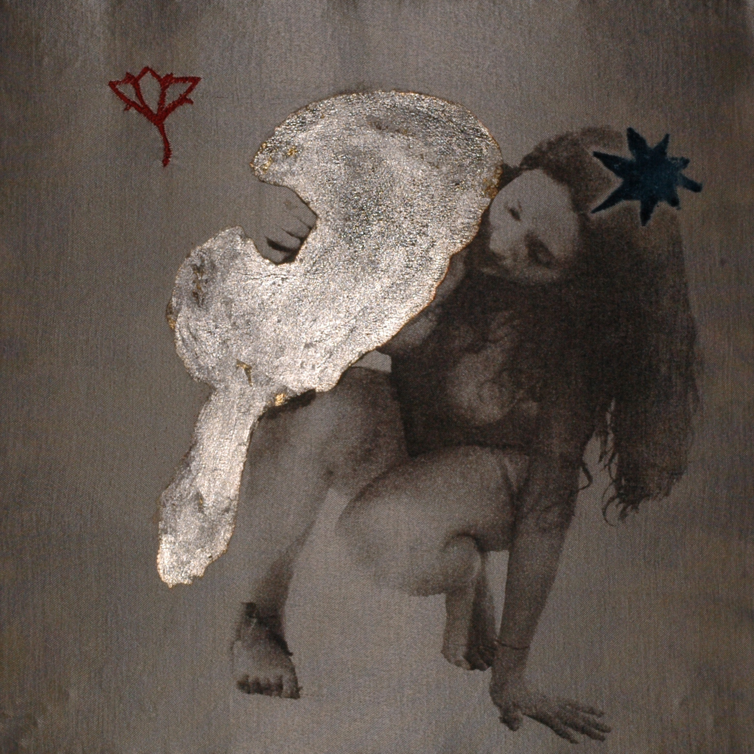 _2005_stampa manuale,foglia oro e argento ricamo industriale su raso_27x27cm. cad.