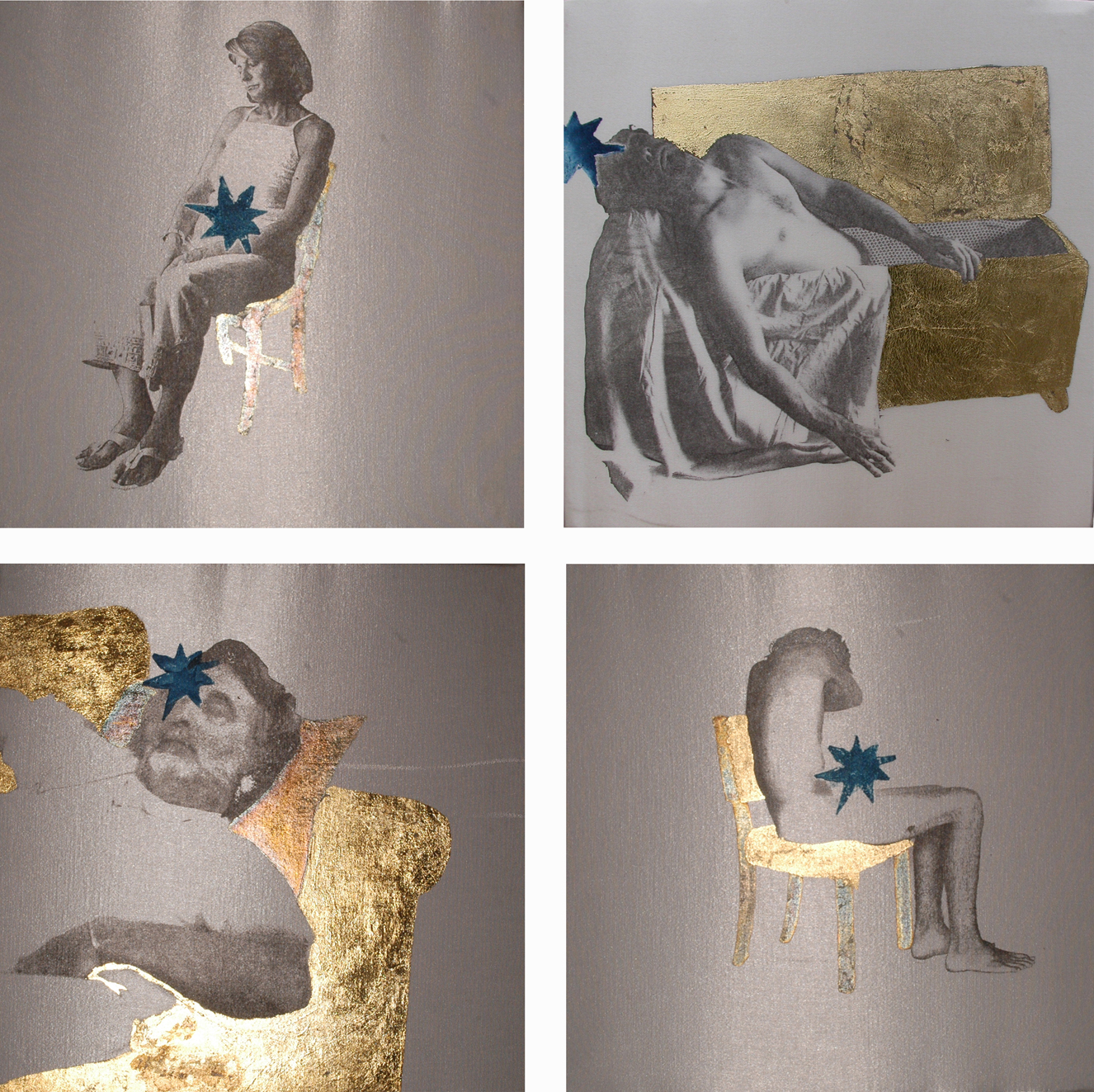 2005_transfert e stampa calcografica, foglia oro e argento su stoffe_27x27cm. cad.