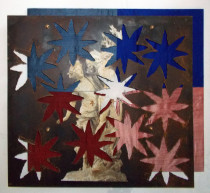 Il mito di Apollo e Dafne interpretato in forma ludica creando un bersaglio immedesimandosi in Eros che muove questa vicenda mitologica scoccando i dardi dell’amore e dell’odio. 2014_ferro, stampa laser, seta, frecce magnetiche_90x90x20cm.
