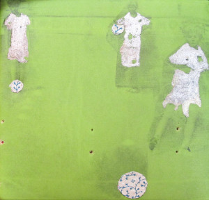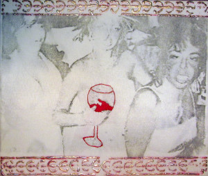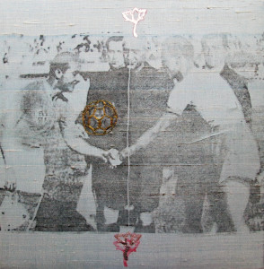_Giuoco a 3_2015_stampa transfert, colla, foglia d’oro e ricamo su stoffa_35x35cm.