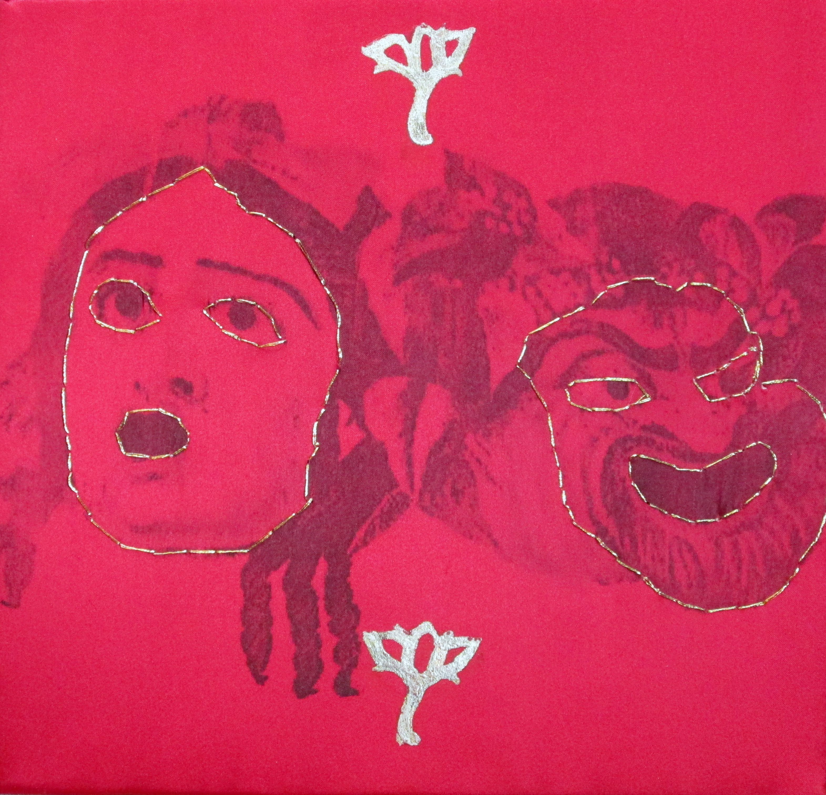 _Maschere di tutti i giorni_2015_stampa transfert, colla, foglia d’oro e ricamo su seta_35x35cm.
