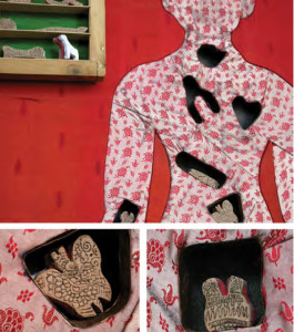 _2012_seta di sari, legno pirografato, trottola, stoffa adesiva, swarovski, ceramica e argento, carta, matita colorata, ferro_29x29x100cm.