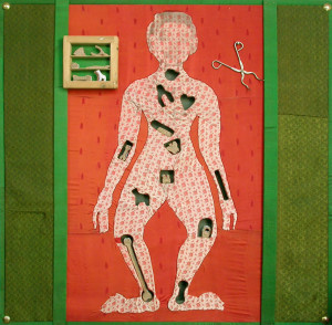 2012_legno pirografato, feltro, rame, stampa transfert su seta, pinze e meccanismo elettrico_130x130cm.