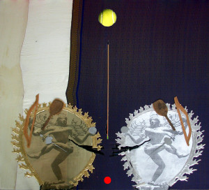 2005_stampa transfert, colla, legno, palline su sete_80x80cm.