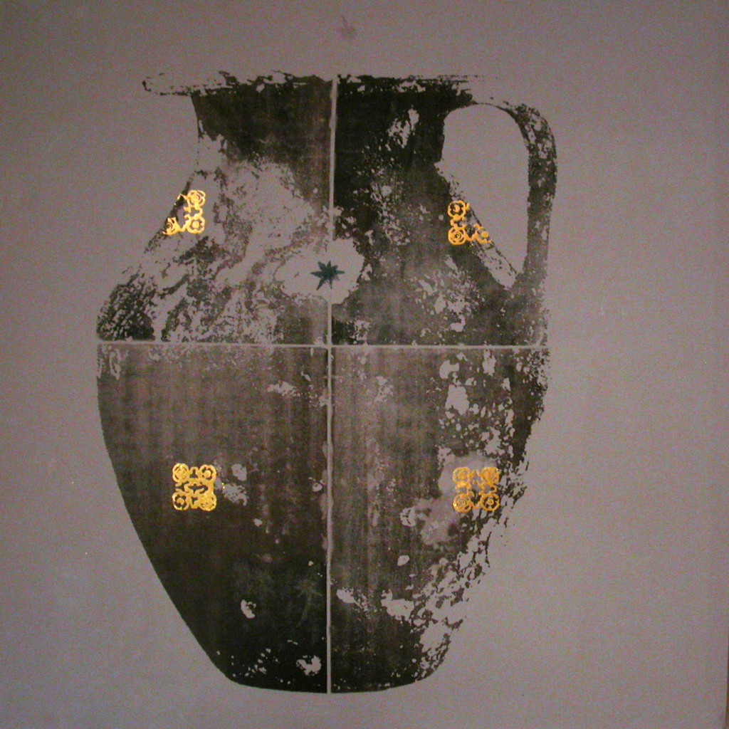 _Anfora_2001_stampa transfert e calcografica, foglia d’oro su stoffa catarifrangente_100x100cm.