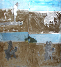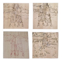 _2011_raso, stoffe, sabbia, polvere di marmo, mosaico, tappi e acrilico su legno_90x50x20cm _2011_tappi, stampa laser, vernice_2,7×2,7cm. cad.
