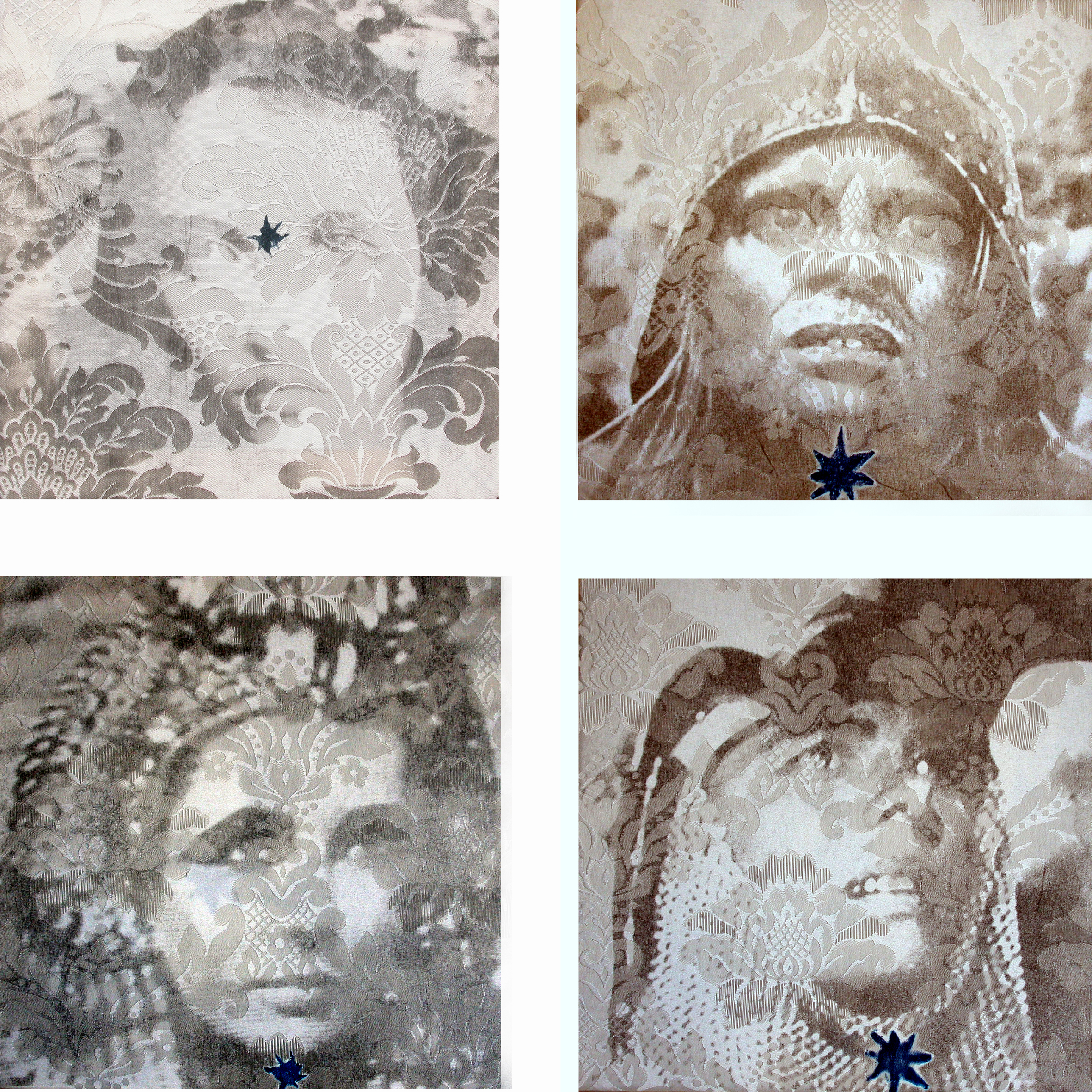 2005_transfert e stampa calcografica, foglia oro e argento su stoffe_27x27cm. cad.