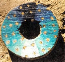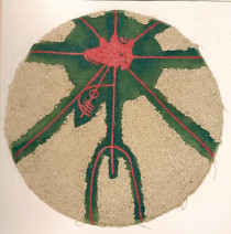 Il mito di Apollo e Dafne interpretato in forma ludica creando un bersaglio immedesimandosi in Eros che muove questa vicenda mitologica scoccando i dardi dell’amore e dell’odio. 2014_ferro, stampa laser, seta, frecce magnetiche_90x90x20cm.