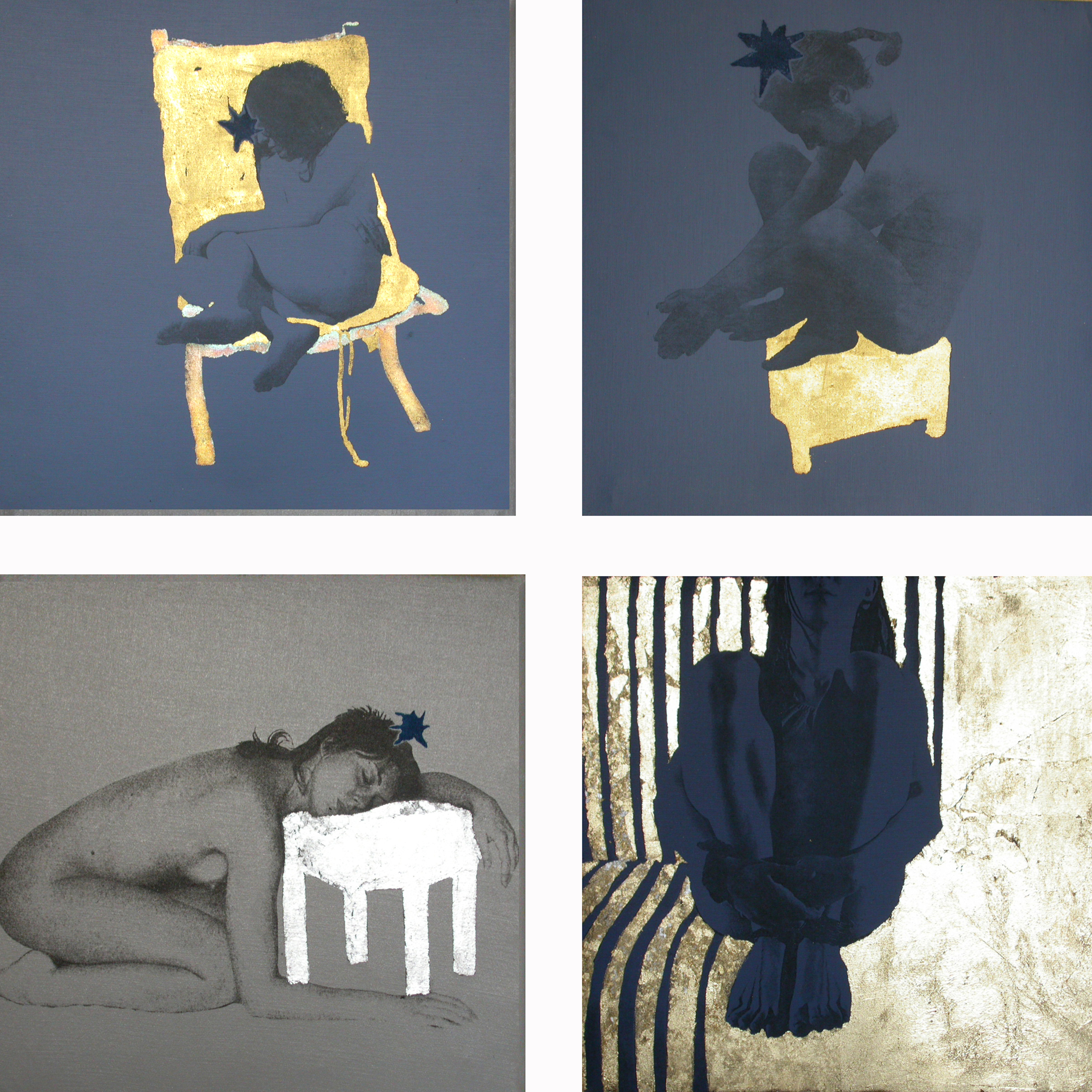_2005_stampa transfert e acquaforte, foglia d’oro su raso_18x18cm. _2005_ stampa transfert e acquaforte su pelle_18x18cm. _2005_stampa transfert e acquaforte su raso, foglia d’oro_18x18cm.