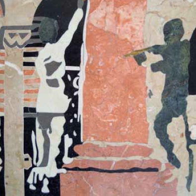 Il tratto definito dal pennello sulla superficie della colonna si concrettizza nel lavoro scultoreo, realizzato in commesso fiorentino da artigiani indiani, la stessa tecnica impiegata nel Taj Mahal – il mausoleo fatto erigere nel 1632 dall’imperatore moghul Shah Jahan – e importata in India da artigiani toscani. Un’ideale fusione tra due antiche tecniche.